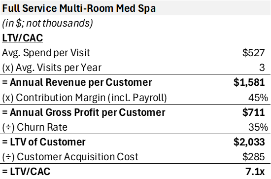 Med spas have some of the best unit economics across retail businesses. The startup costs can be hefty for individual investors, but the return on investment once the location is fully ramped is attractive.