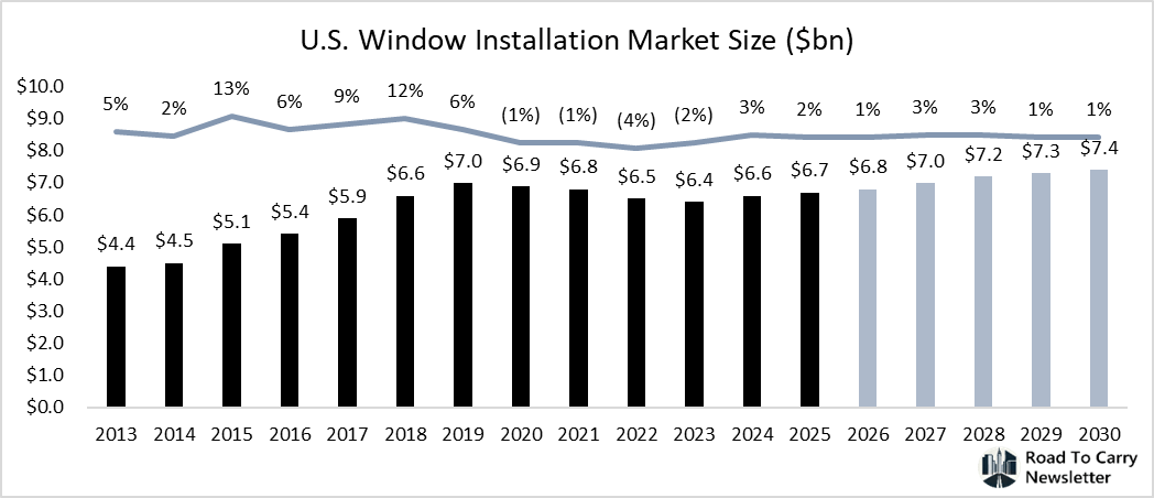 The U.S. window installation contractor industry is a $6.7 billion market in 2025. After a modest decline through 2020–2023 due to COVID and interest rates, it resumed growth and is forecasted to reach $7.4 billion by 2030.