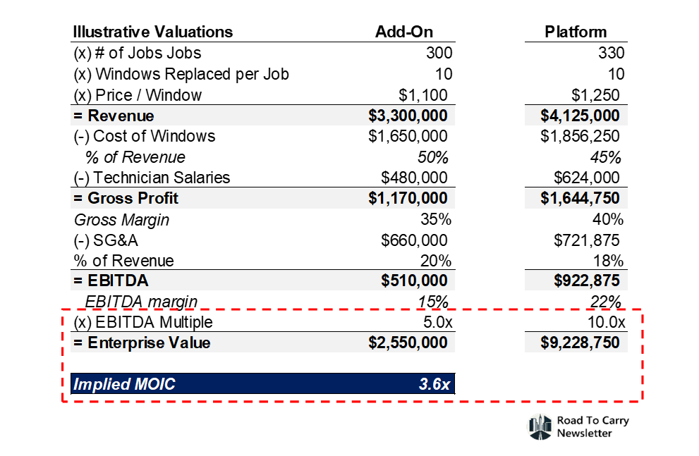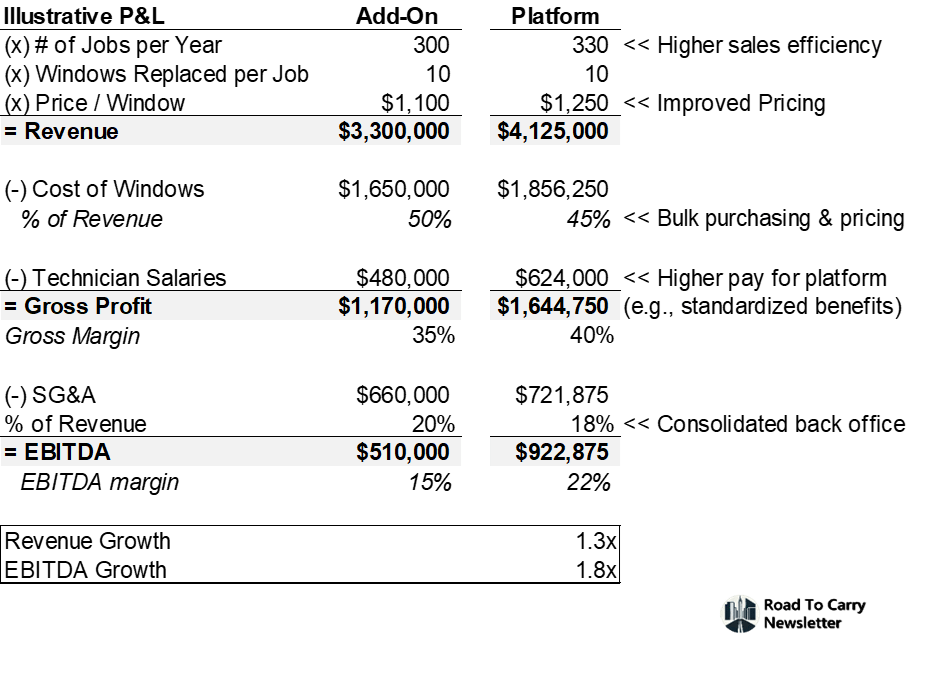 That's roughly a 2x EBITDA from going standalone to platform. Revenue grows, costs compress, and the bottom line expands dramatically. The math works.